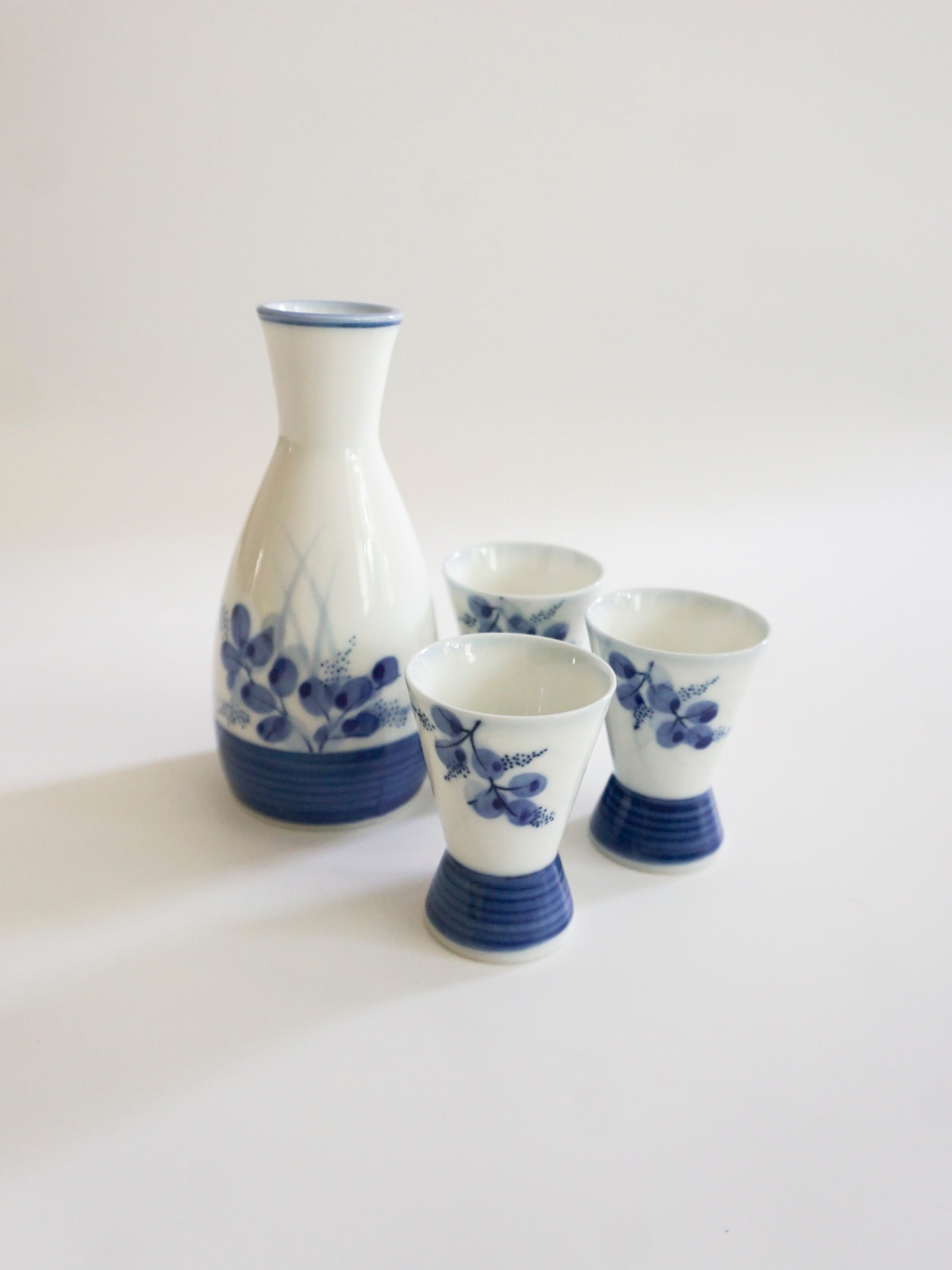 Made by Hagi Kiln, Mino ware, porcelain, the set features a white ground decorated in cobalt blue with hagi (bush clover) motifs. Deep indigo bands circle the rim and body, adding a bold accent. Each piece shows slight variations in the hand-painted design, giving it a unique character.