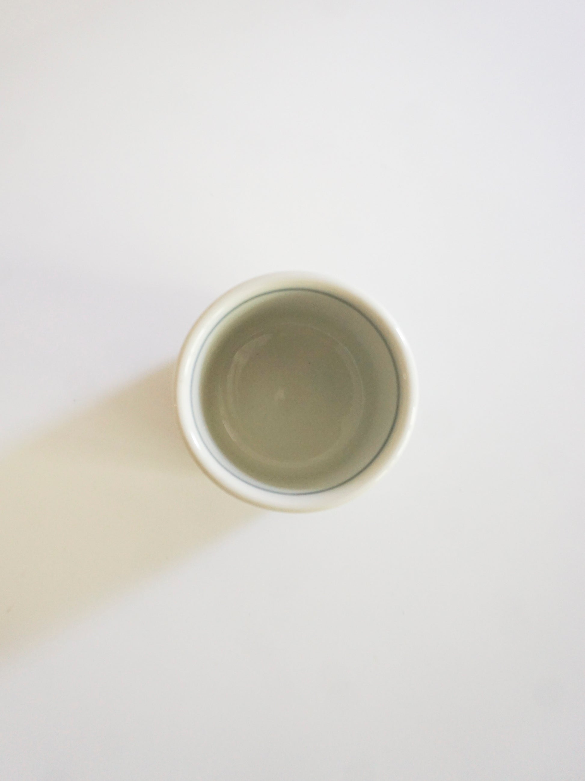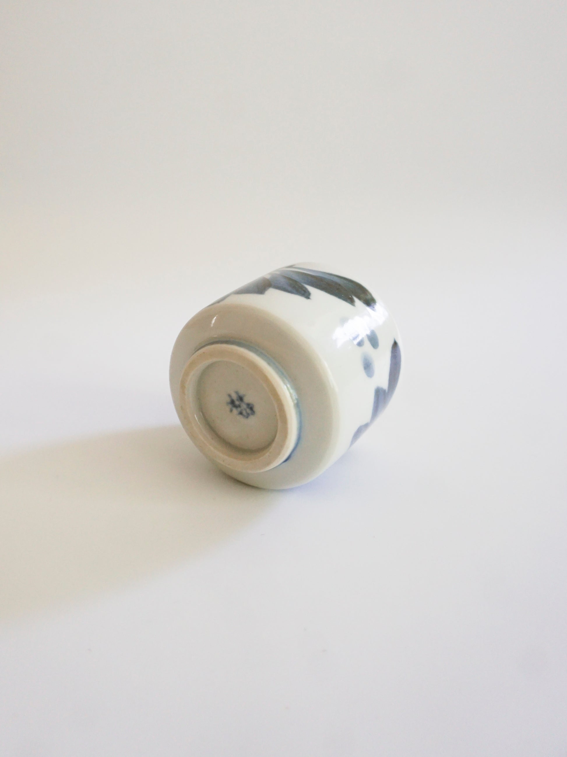 A small sake cup from Tobe-yaki, hand-painted with the bold and flowing “gōsu-kiku” (indigo chrysanthemum) design.