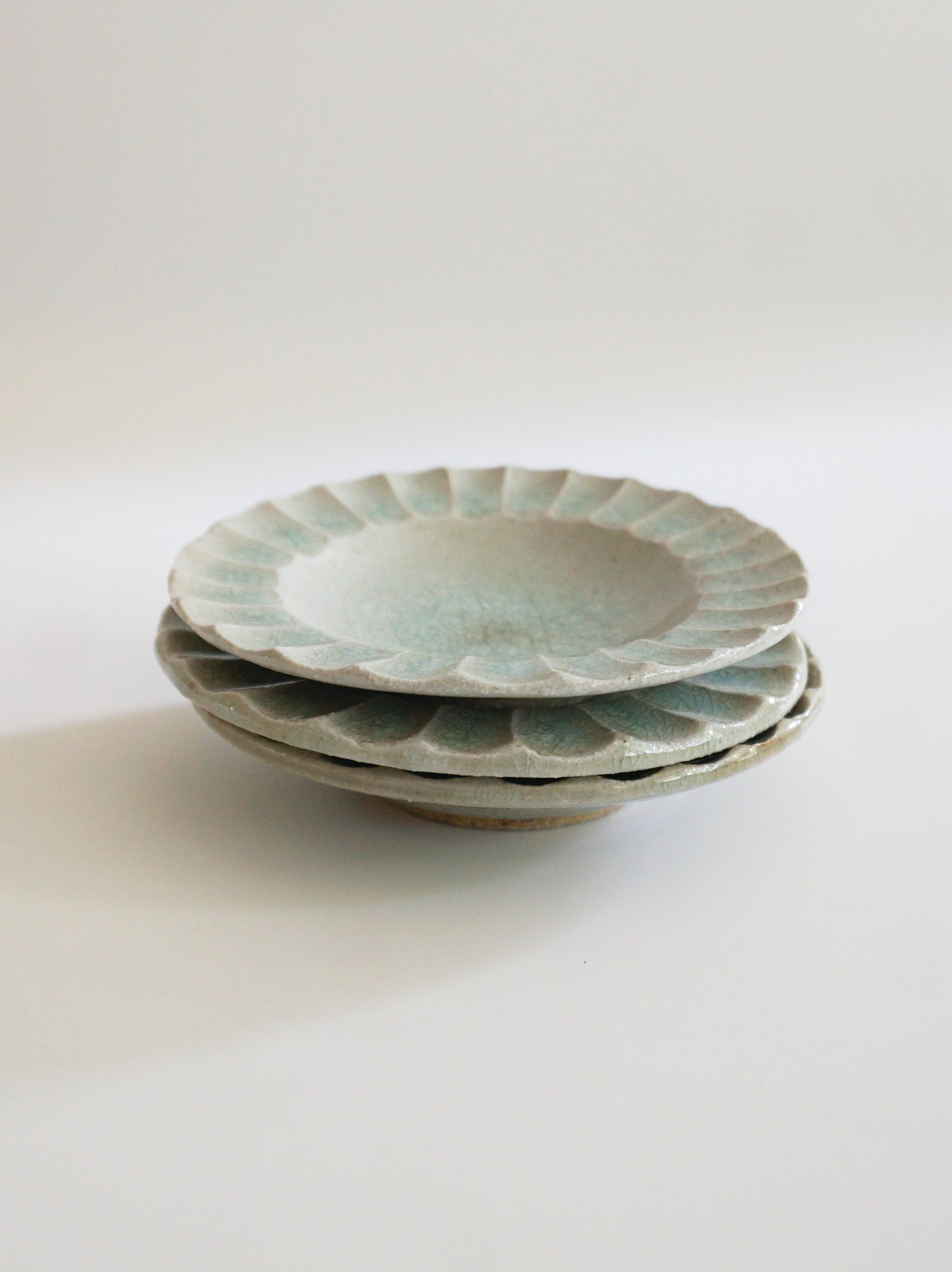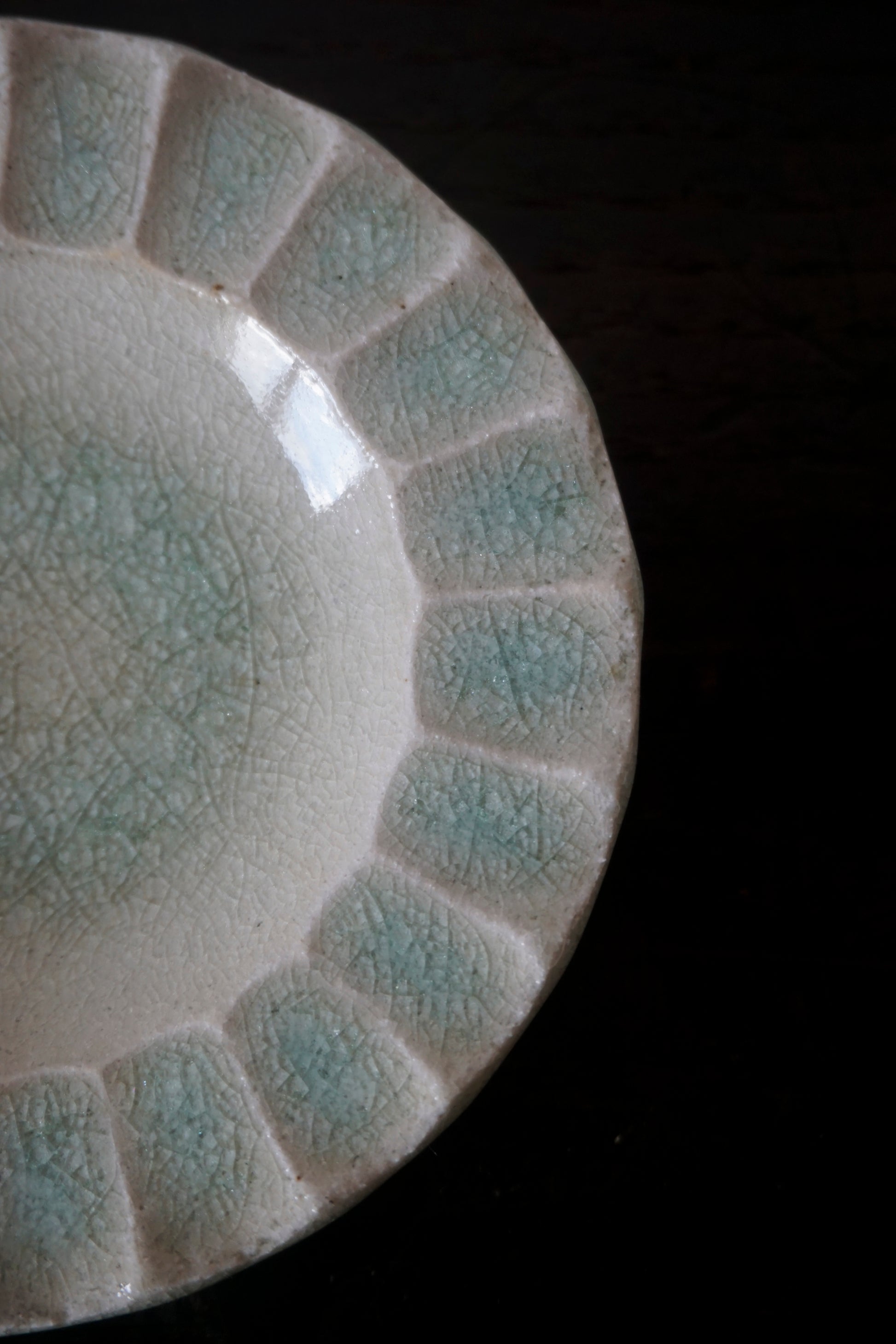 Each piece is carefully shaped on the potter’s wheel, then covered with a soft bluish glaze known as Ofuke-yu. The rim is decorated with gentle shinogi (carved ridges), which catch the light and reveal shifting shades of glaze—like looking into a quiet, miniature landscape.