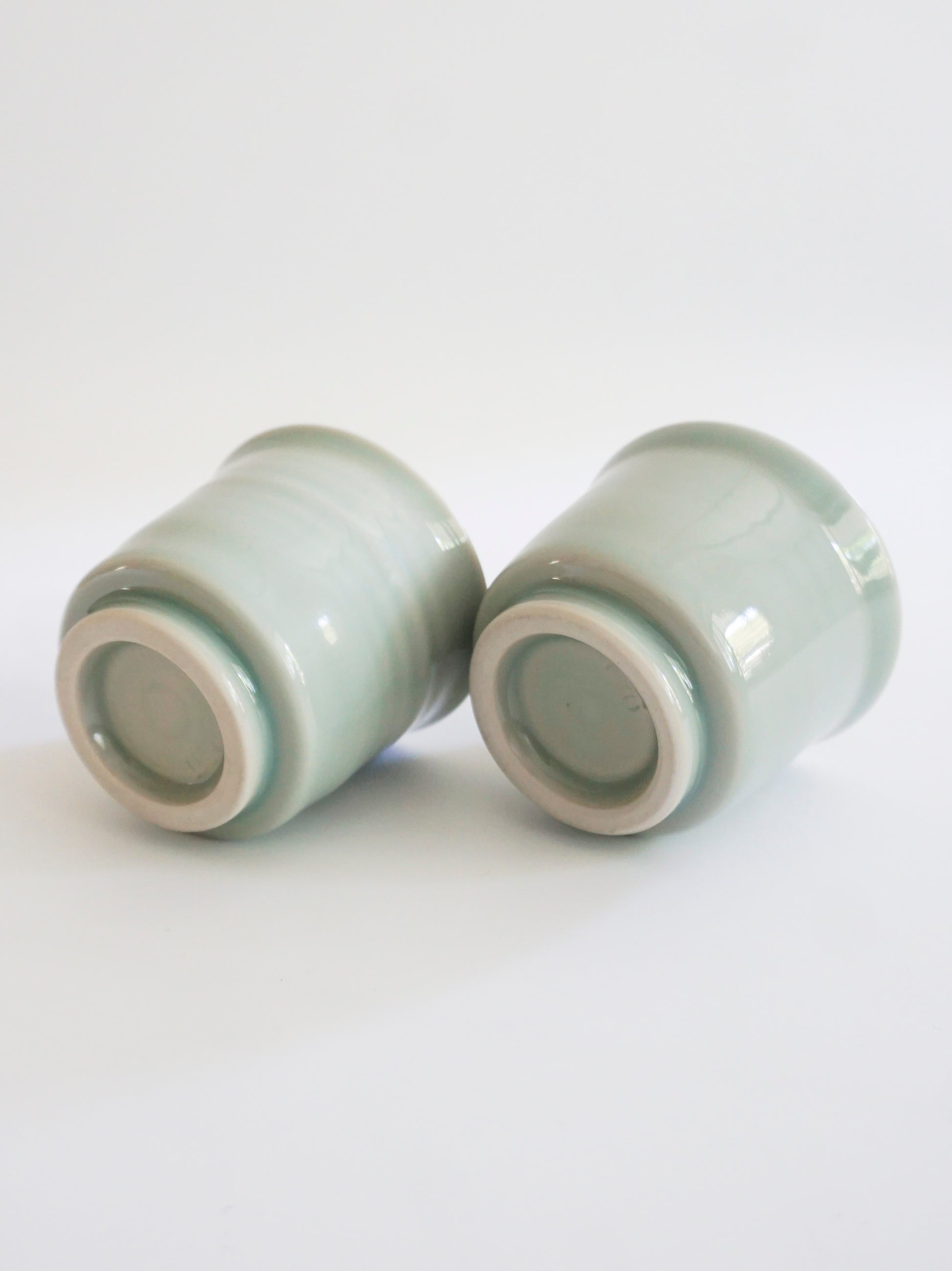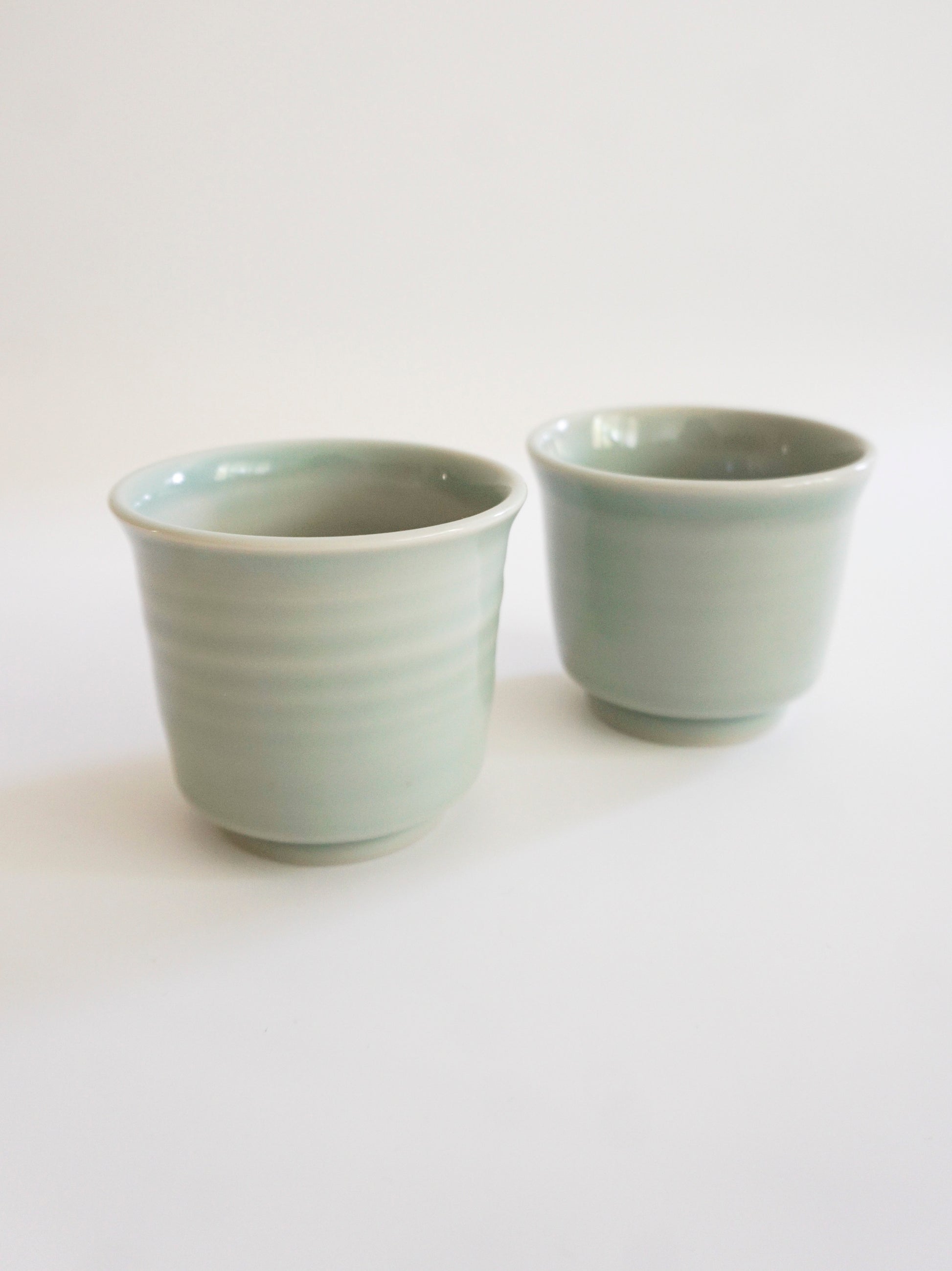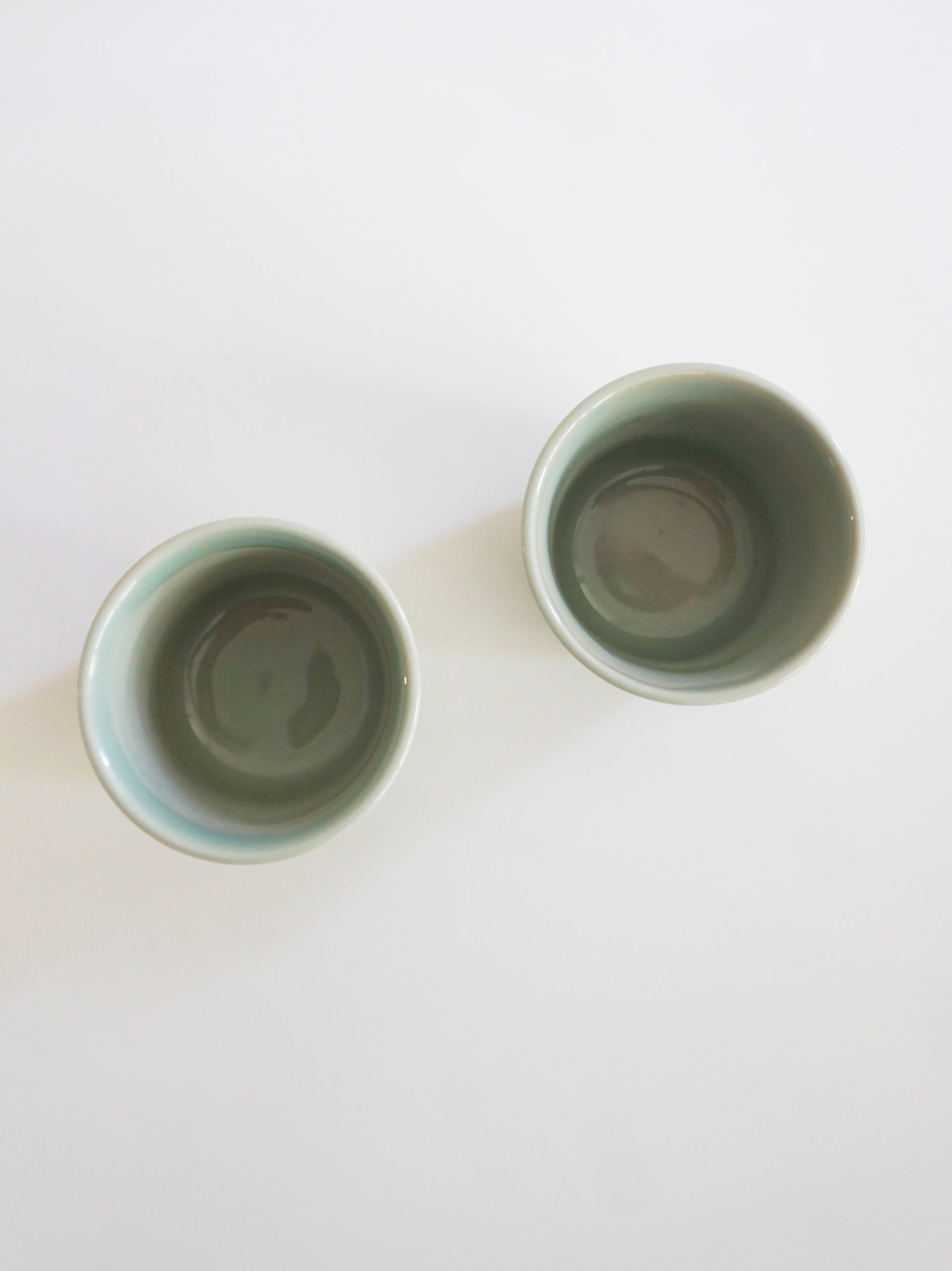 A set of two celadon tea cups crafted by Jin-gama, a kiln in Arita.